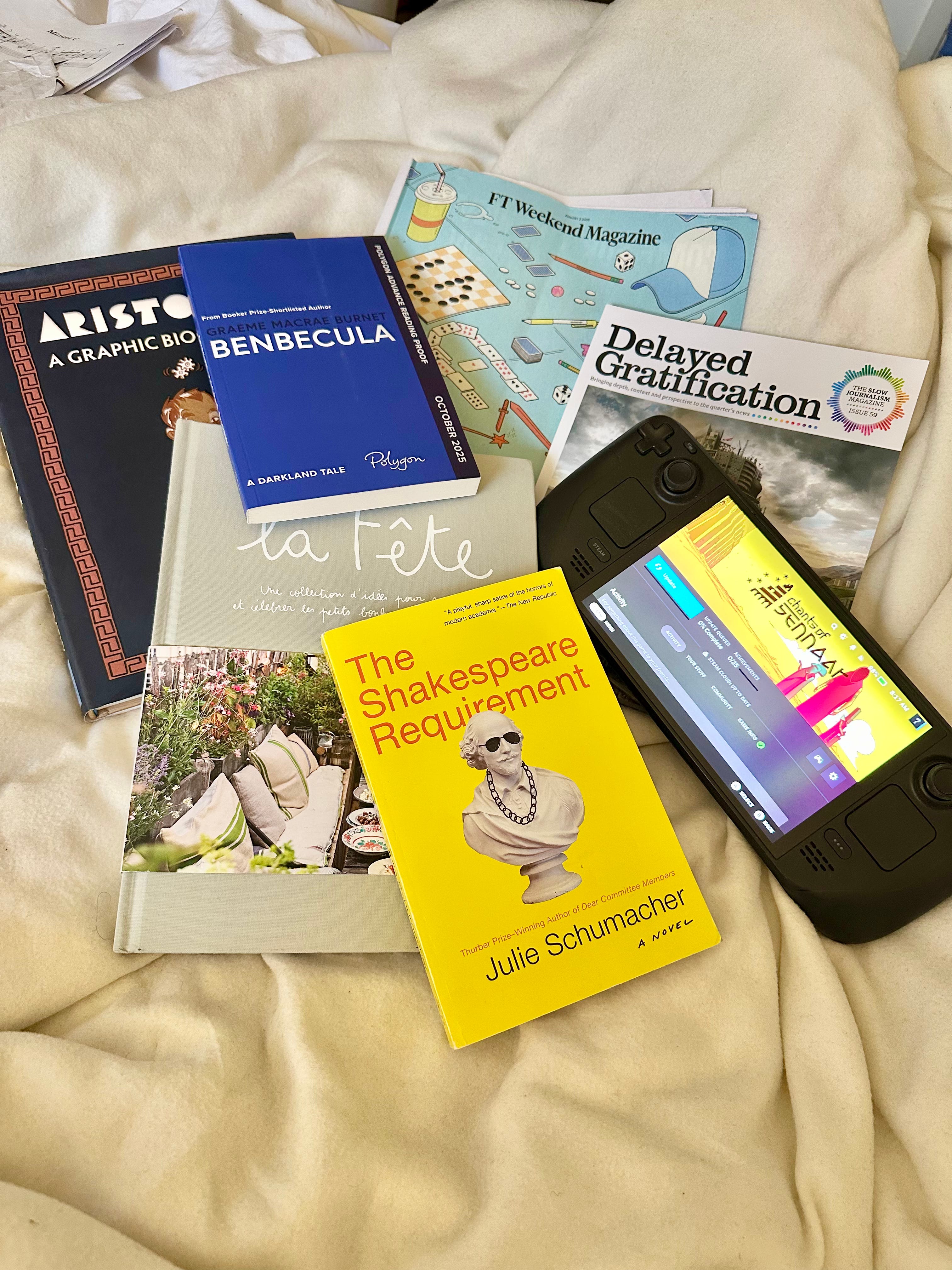I came to a realisation about this when I noticed that I have been keeping the FT Magazine’s yearly games issue since the start of August because I loved last year’s one so much that I keep thinking “I am going to enjoy that so much” but then every moment I might do all the puzzles and enjoy reading the articles I think “this moment is not quite special enough”. Also by my bed waiting for the perfect moment I have: