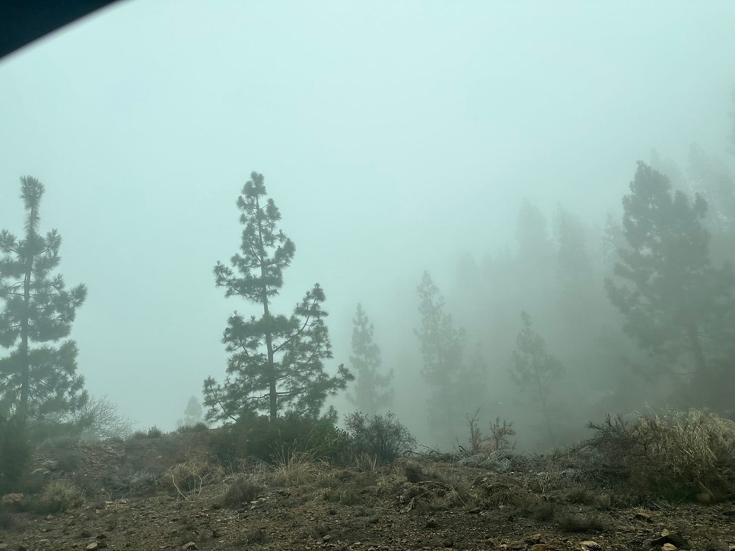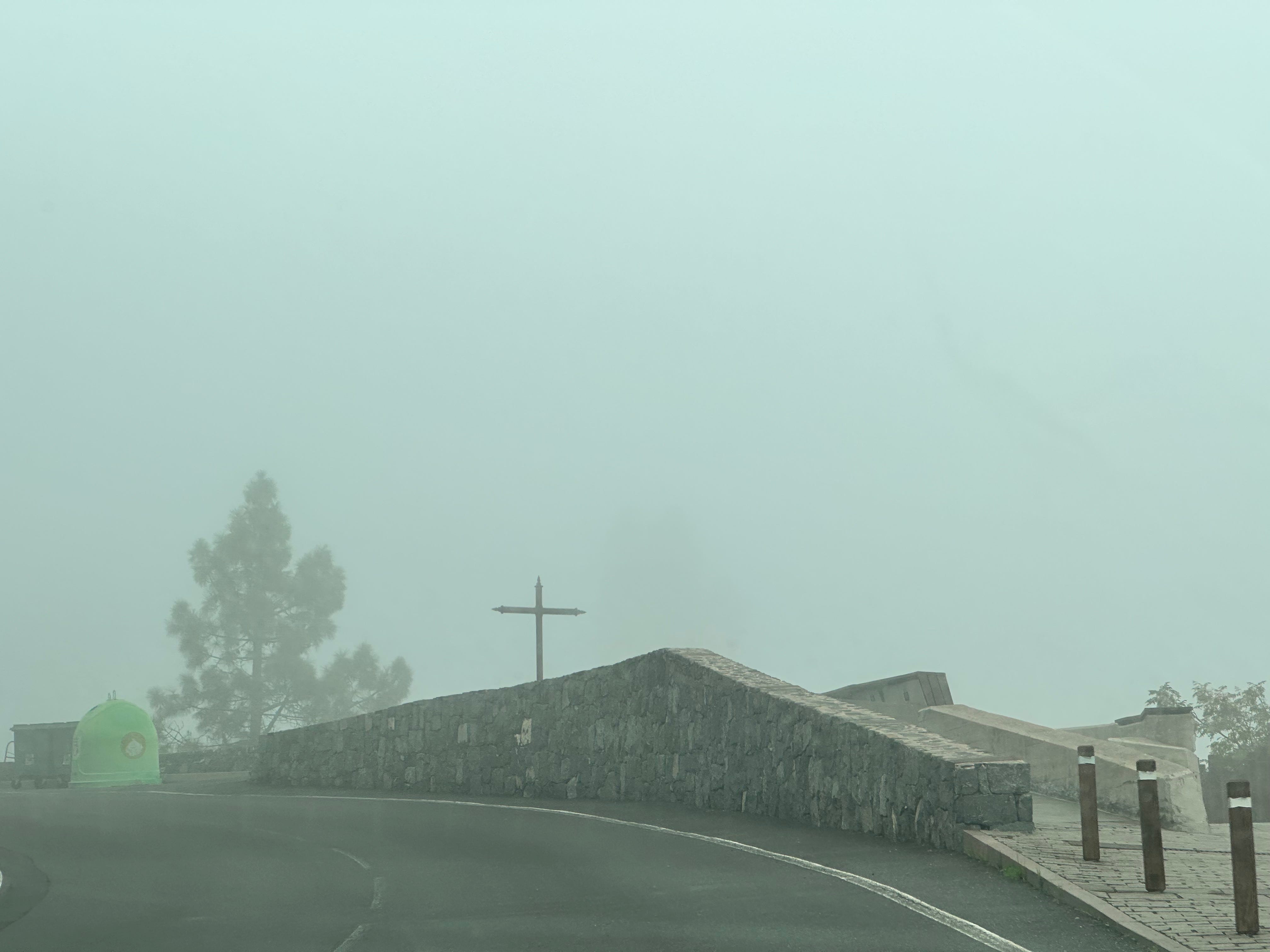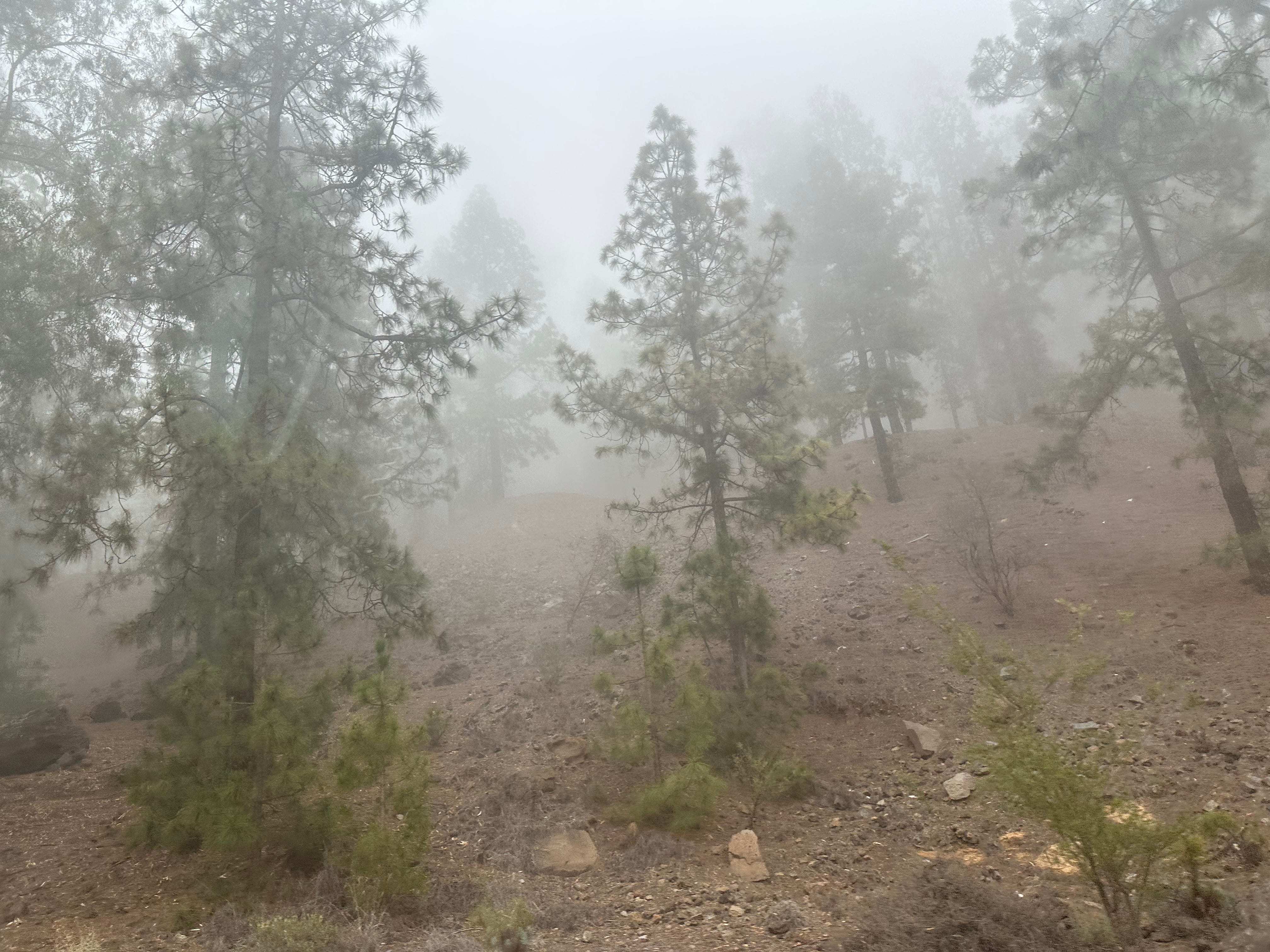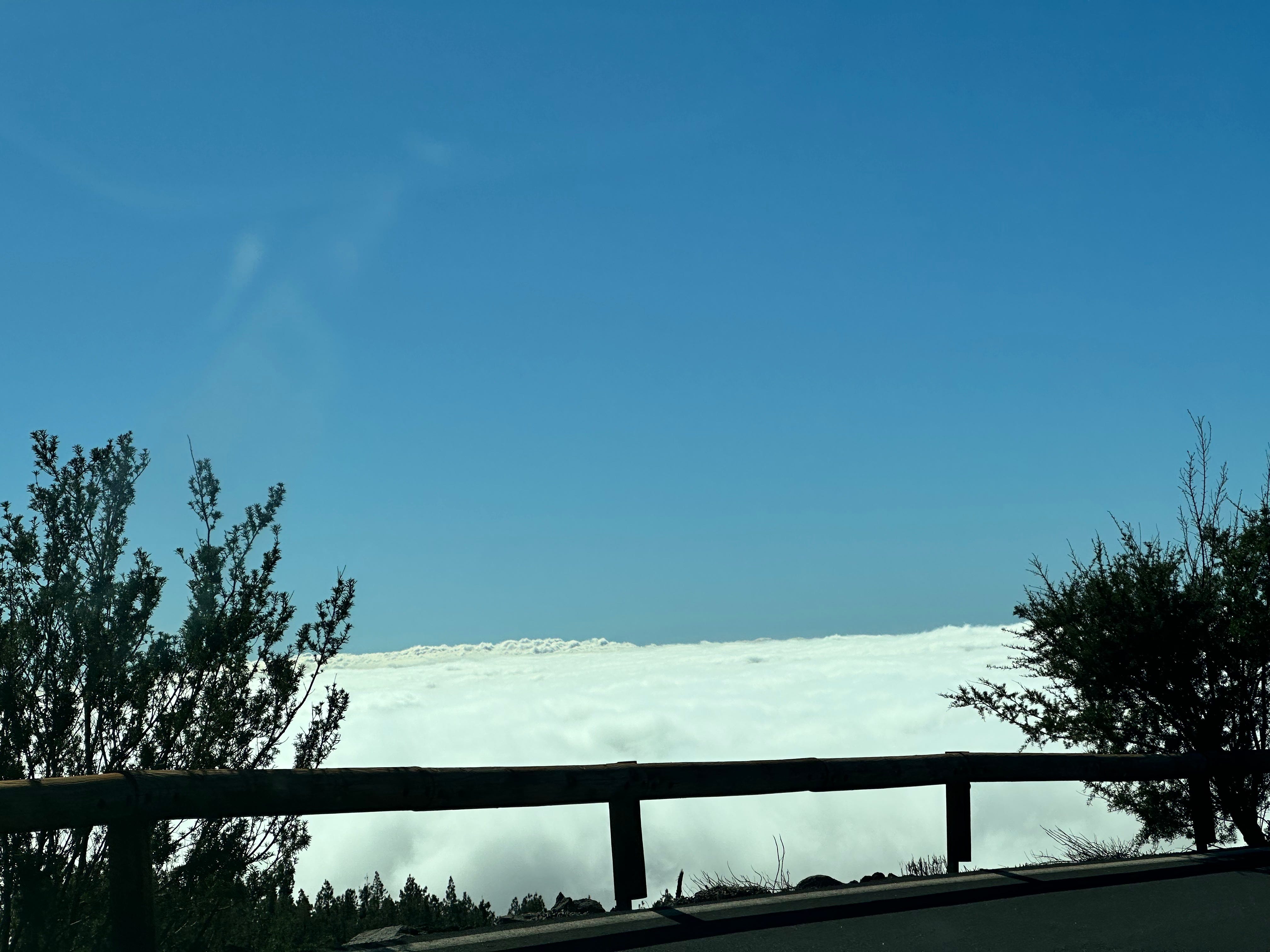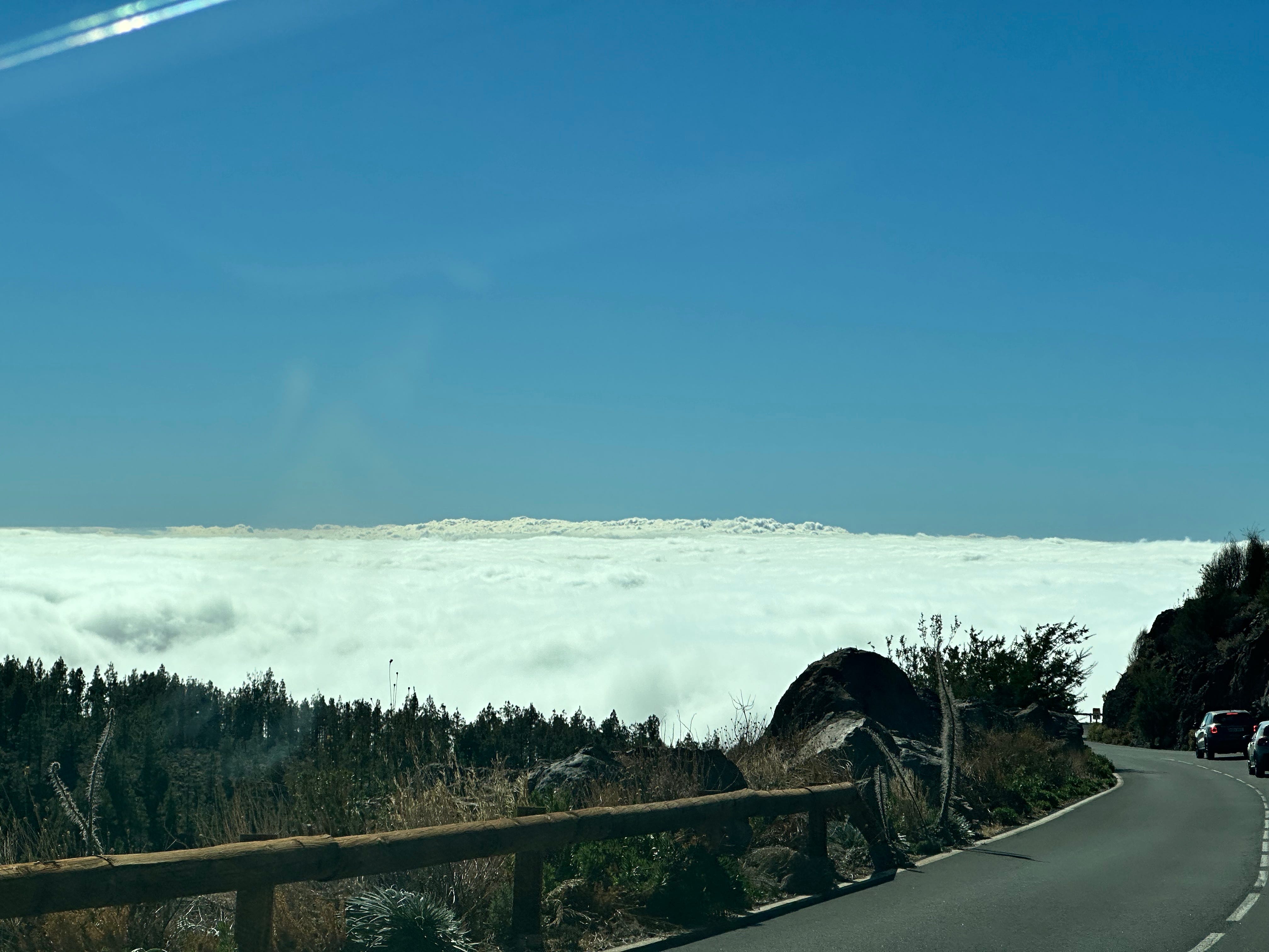 first the view as we started the drive then as we entered the cloud, suddenly we’re in a very eerie movie about eg encountering your past and future selves in a strange wood things looming up out of the mist perfect place to bury a love rival? I’m sure in the sunshine that is just a very nice mattress/sofa to sit on in the sun. but in the cloud, extremely eerie what’s in those woods? oh, just the past and the god Pan. the god Pan lives up there. these trees don’t like you. they’ve been here for hundreds of years and they just. don’t like you. but suddenly, is that blue in the sky? could be, though it’s all still looking a bit sinister no that’s definitely blue literally, there are the clouds at the edge of the road you can look down on them. the valley is a bowlful of cloud like a bowl of whipped cream literally there’s the cloud looks like you could walk on it (don’t try) I don’t know why this mountain is glowing like that, but there we go it’s Tenerife. it’s actual Tenerife. Tenerife. Which until a few years ago I thought of as the most boring Anglo holiday destination in the world. Shows what I know.